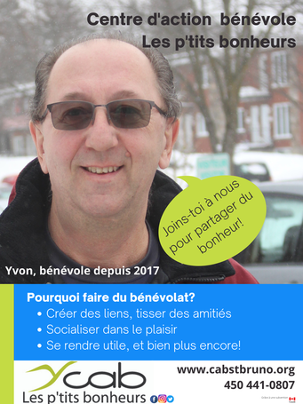 Sans eux, le CAB « Les p’tits bonheurs » ne pourrait pas offrir d'activités et de services à la population. Pour assurer et maintenir notre offre, nous sommes toujours à la recherche de bénévoles pour nos services, mais aussi pour les besoins d’autres partenaires situés sur le territoire de Saint-Bruno-de-Montarville.