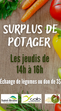 Durant la belle saison, les jeudis après-midis sur le terrain du CAB, un kiosque est mis à la disposition des citoyens qui ont un potager pour qu'ils puissent y partager les surplus de leurs récoltes. La municipalité de Saint-Bruno est également partenaire, grâce à ses plates-bandes gourmandes.